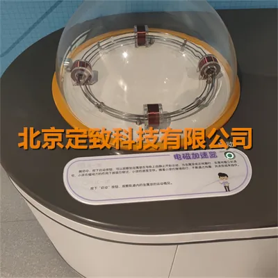 展项主要由台体、通电线圈装置、轨道及小球装置等构成。电磁线圈通电后就会产生磁场,把钢球向线圈方向吸引移动。当钢球触碰金属感应器时,电源将被切断,电磁力消失,钢球依靠惯性继续前行,直至进入第二个线圈入口。展品展示了电磁加速器的原理,加深观众对电磁加速的认识。