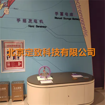 互动时,观众旋转手柄带动磁铁旋转,线圈切割磁力线产生感应电流,点亮led灯。