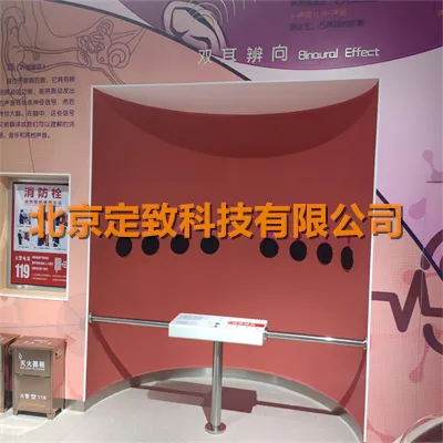 发声系统设置在一个半圆周上,共设置8个点,观众互动时,点击启动,8个点随机响起声音,然后提示观众判断从哪个点发出,观众通过按钮回应,回答正确给与奖励,回答错误,提示从新选择。